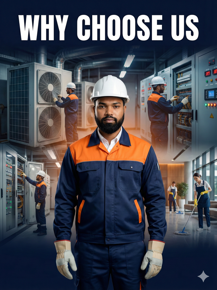 To provide high-quality Electrical, Mechanical, HVAC, MST, Carpentry, Housekeeping, and allied facility services with professionalism and accountability.